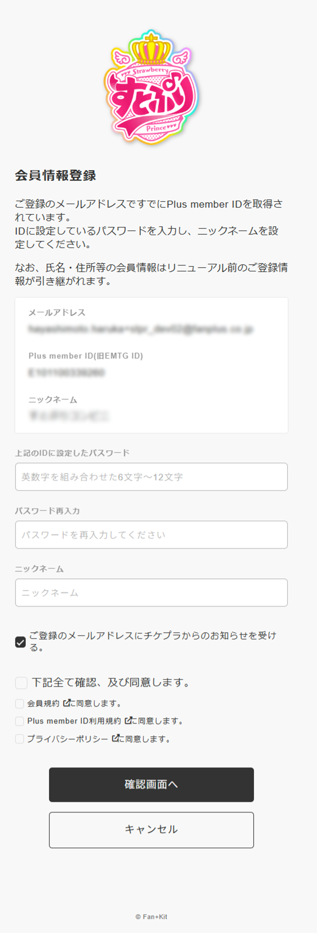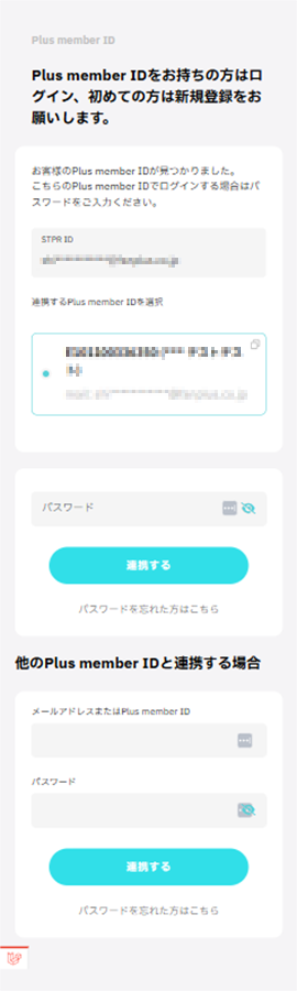 ※他のSTPRのグループですでにSTPR IDでログインされている場合、STEP4~STEP5はスキップとなりますのでSTEP6へお進みください。 入力したメールアドレスに紐づけるPlus member IDが表示されます。 ※他にPlus member IDをお持ちの場合、ページ下部にPlus member IDをご入力ください